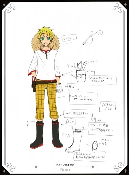 Finnian a les cheveux courts, hérissés, blond et de grands yeux turquoise. Autour de son cou, il porte un chapeau de paille de manière a cacher un tatouage sur sa nuque "S-012", qu'il a obtenu suite à un rôle de cobaye. Il est vêtu d'une chemise blanche avec des contours rouge et un pantalons trois-quarts.