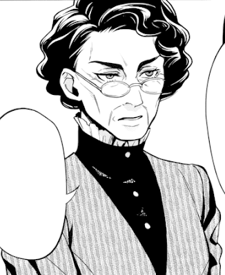 È una donna con occhi chiari e capelli neri; porta gli occhiali.