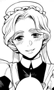 È una ragazza con occhi chiari e lunghi capelli biondi.