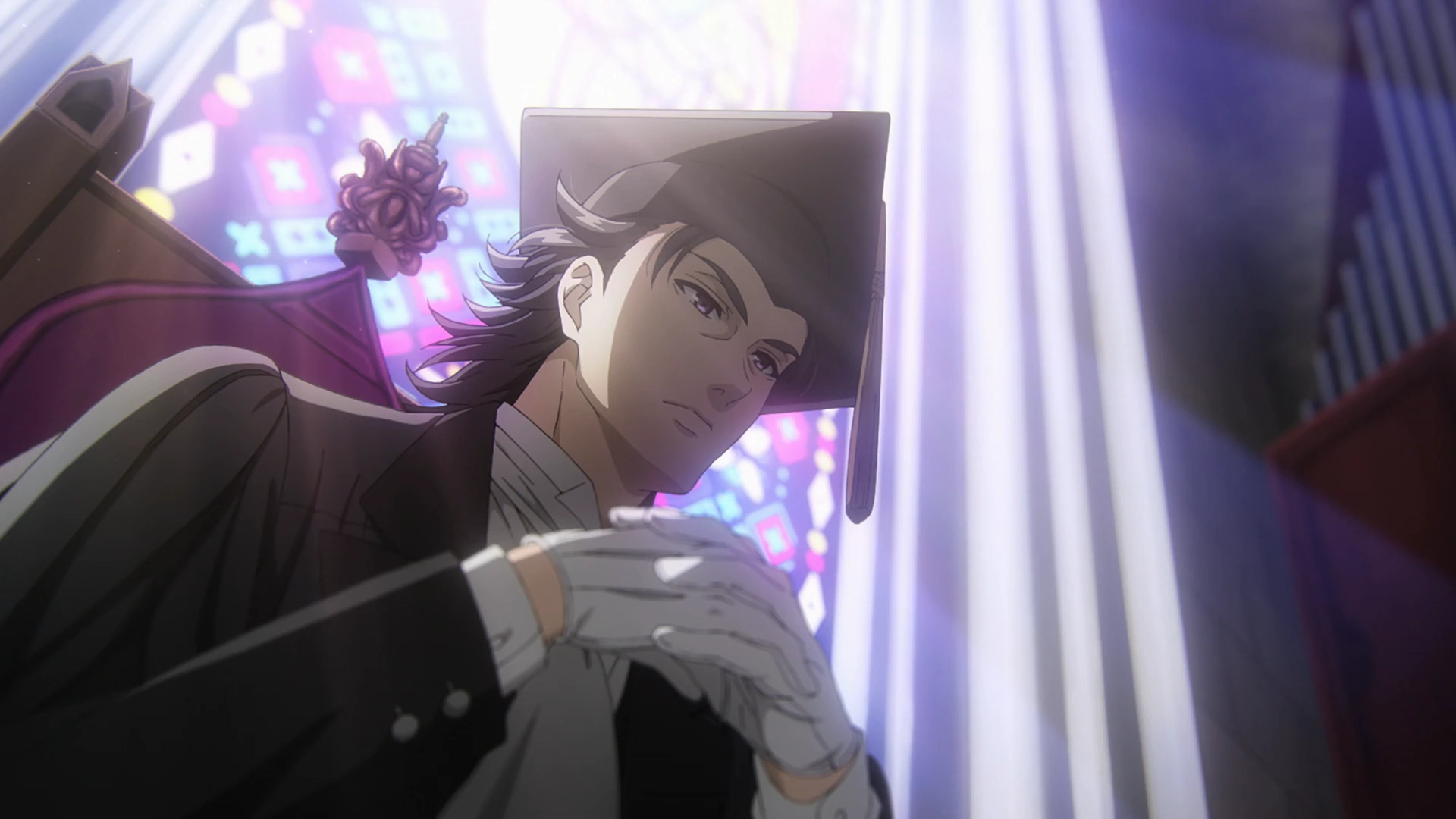 Johann is a tall man with dark, messy hair. He wears white gloves, a small scarf tied around his neck, and a scholar's hat on his head. He dresses in a long robe, with a buttoned-up shirt tucked underneath.