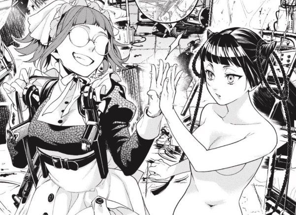 While Finny is running with Sieglinde and Tanaka in his arms, Mey-Rin is positioned from above a cliff. When he leaps off and into the river, Mey-Rin snipes the German soldiers firing at him. When she notices Grete Hilbard dart out from behind a bush, she is too slow to aim at her. When Grete fires, Tanaka comes into his human form, slicing the bullet into two. He tells Finny to run ahead.[142]