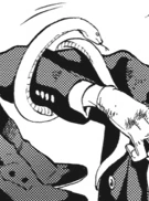 The evening of the first class' dinner party, Snakes leaves the party to share his food with his snakes in the freight room. Right after Ciel and Elizabeth Midford find Snake and his snakes there, they are attacked by Bizarre Dolls.[21] They climb on top of luggage to escape and are later rescued by Sebastian.[22] Afterward, Ciel sends Sebastian to help his family while he, Snake, and Elizabeth follow Rian who came to the freight room earlier to his room.[23] When they arrive in the 2nd boiler room, the Campania hits an iceberg and water gets into the ship. Ciel and Elizabeth get separated from Snake and Rian, and Snake sends them Keats to guide them through the duct.[24]
