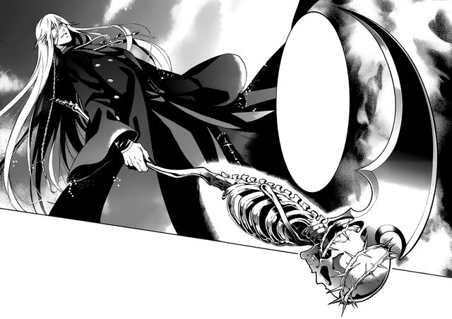Undertaker and Othello taunt each other. Othello tosses his Death Scythe, but to no effect since he is physically weak, to the amusement of Undertaker.[65] Grelle launches into battle with Undertaker, and Sebastian joins in hopes of capturing Undertaker, as well.[66]