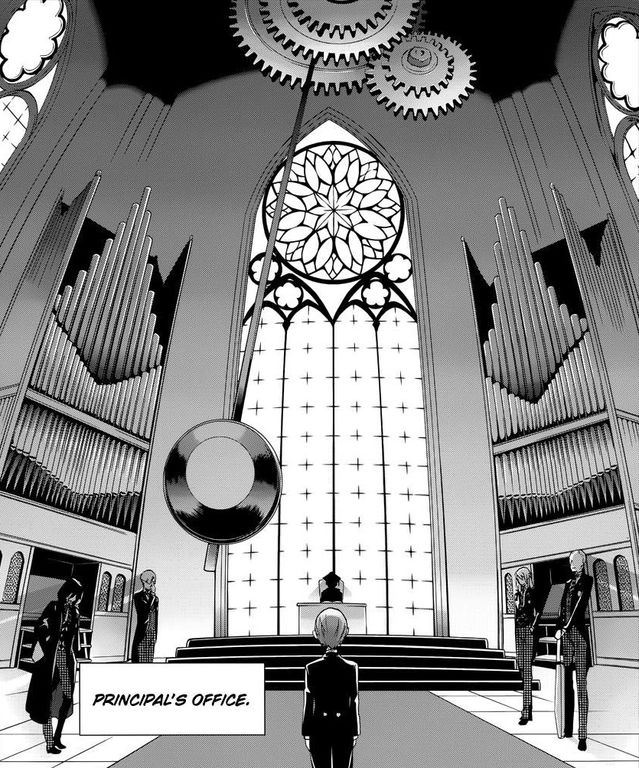 The office consists of a spacious room with vast, intricate windows. Gears hover overhead, and there is a rug along that extends to steps which lead up to the headmaster's desk. Pipe organs are set to the sides of the room, and a large pendulum swings in the center.